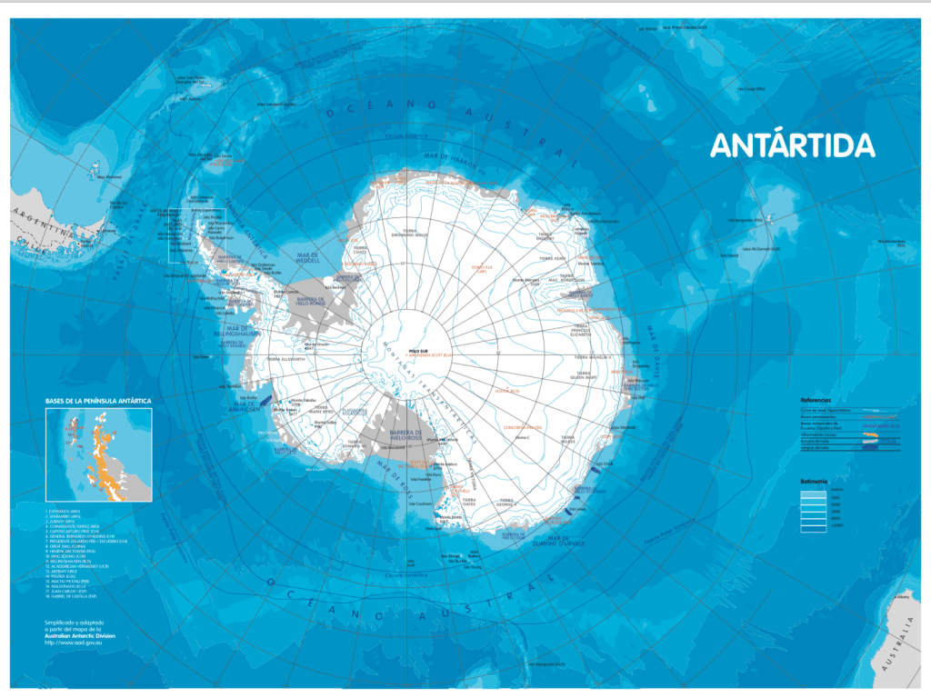 Mapa: se entrega a los centros un mapa a gran escala del continente antártico con las bases de los diferentes países y los accidentes geográficos más importantes. (2011)